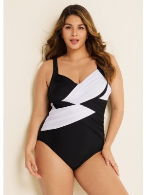 Elegant black and white color block one-piece with V-neck and ruched, twisted cross-front detail. Adjustable straps and fixed pads provide wireless support. A refined option for swim wear for ladies plus size and modest bathing suit lovers.