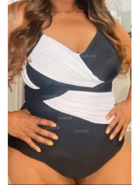 Flash Sale LILYEASE ® Black And White V Neck Crossover Pleated One Piece Swimsuit