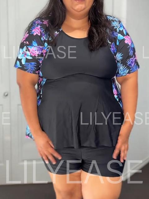New LILYEASE ® Black Floral Print Upf50+ Short Sleeves Vintage Plus Size Swimsuit Tankini Top