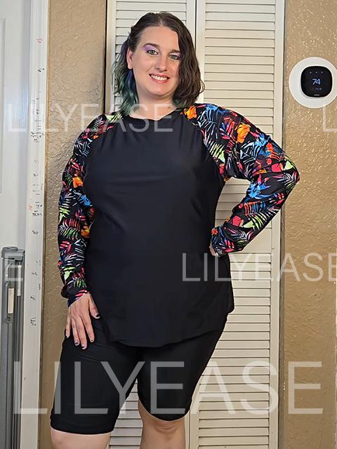 Hot LILYEASE ® Black Leaf Print Long Sleeve Plus Size Swimsuit Swimwear Tankini Top