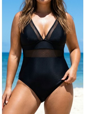 Confident and chic! This solid black women's onepiece swimsuit has a Vneck,adjustable straps,mesh panels at neck and waist,and tummy control.Ideal curve bathing suits and bathing suits for older women.