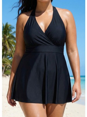 Discover your favorite swimming attire for female! This Vneck solid one piece swim dress features a flattering wrap design and mesh skirt overlay.Fixed pads and adjustable straps offer confident comfort for plus size women.