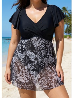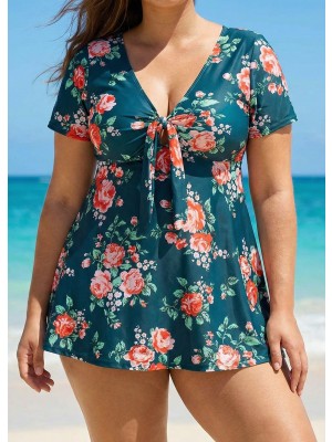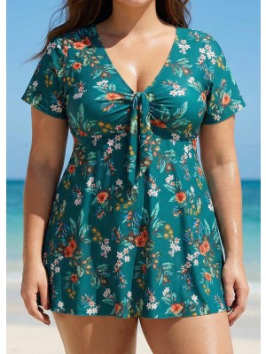 Make a splash in this two piece bathing suit for women! The Vneck leaf print top features a charming bust tie detail,paired with lowrise swim briefs.Removable pads offer comfort,making it a conservative swimsuit ideal for curvy women.