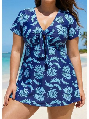 Blue Leaf Print Front Knot Short Sleeve Swimdress Set