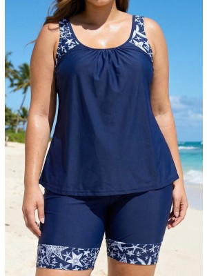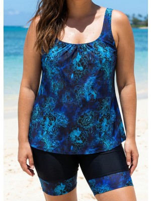 Blue floral tankini set balances modesty and sportiness! Flattering print, stretch fabric, perfect for active curvy girls.