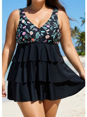 Plus Size Floral Print V Neck Layered Swimdress Top