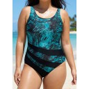 Plus Size Green Leaf Print Color Block Swimsuit One Piece Swimsuit
