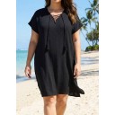 Black Lace Up Neckline Short Sleeves Plus Size Bathing Suit Cover Ups Dress
