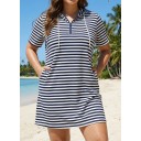 Plus Size Navy Striped Drawstring Hooded Beach Cover Ups Tee Dress