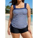 Navy Stripes Wide Straps Side Drawstring Two Piece Bathing Suits Tankini Top