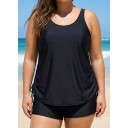 Black Solid Color Drawstring Plus Size Tankini Top