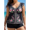 Black Floral V Neck Ruffled Sleeve Curvy Swimsuit Tankini Top