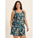 Green Swimming Costume Tropical Floral Scoop Neck Wide Strap Pocket Plus Size Swim Romper