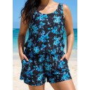 Plus Size Blue Floral Vintage Wide Straps Pocket Women's Swimsuit One Piece Swim Romper
