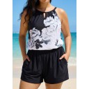 Black And White Floral High Neck Vintage Pocket Plus Size Swimsuit One Piece Swim Romper