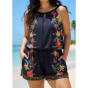 Plus Size Black Tropical Floral Keyhole Neck Modest Pocket Swimsuit One Piece Swim Romper
