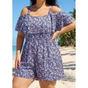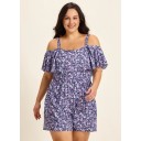 Purple Floral Print Flattering Off Shoulder Ruffled Plus Size Swimsuit One Piece Swim Romper