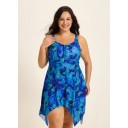 Tropical Leaf Flattering Drawstring Asymmetrical Hem Plus Size Swimsuit One Piece Swimdress