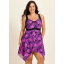 Purple Tropical Leaf Modest Drawstring Asymmetrical Hem Curvy Swimsuit One Piece Swimdress