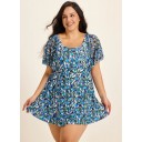 Plus Size Blue Green Floral Print Mesh Short Sleeves Padded Ruffle Swimsuit Swimdress Set
