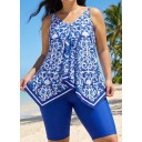 Plus Size Blue Floral Print Flowy Asymmetrical Hem Swimsuit Two Piece Long Tankini Set