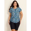Curvy Blue Floral High Neck Upf50+ Short Sleeves Zipper Drawstring Swim Shirt Tankini Top