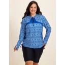 Plus Size Blue Geometric High Neck Upf50+ Long Sleeves Zipper Drawstring Swimsuit Shirt Tankini Top