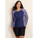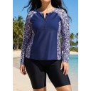 Purple Floral Print High Neck Upf50+ Long Sleeves Zipper Curvy Women's Swimsuit Shirt Tankini Top