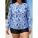 Curvy Blue And White Floral Upf50+ Long Sleeves Side Drawstring Swimsuit Shirt Tankini Top