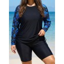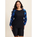 Blue Floral High Neck Upf50+ Long Sleeves Side Drawstring Plus Swimsuit Shirt Tankini Top