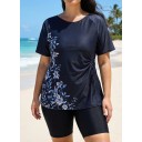 Curvy Black Floral Upf50+ Short Sleeves Vintage Side Drawstring Swimsuit Shirt Tankini Top