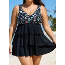Plus Size Floral Print V Neck Layered Swimdress Top