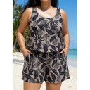 Black Plant Stripe Modest Wide Straps Pocket Plus Size Swimsuit One Piece Swim Romper