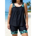 Curvy Black Plant Scoop Neck Flattering Padded Women's Swimsuit Two Piece Tankini Set