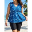 Dark Blue White Geometric V Neck Cap Sleeves Flattering Ruffle Curvy Swimsuit Tankini Top