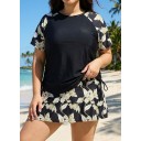 Curvy Black Leaf Upf50+ Short Sleeves Padded Side Drawstring Women's Swimsuit Tankini Top