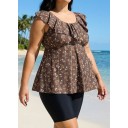 Brown Striped Floral Print Scoop Neck Modest Built In Bra Ruffle Curvy Women's Swimsuit Tankini Top