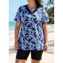 Curvy Blue Leaf V Neck Upf50+ Short Sleeves Modest Padded Swimsuit Long Tankini Top