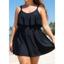 Black Layered Ruffle Trim Adjustable Strap Elegant One Piece Swimdress