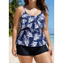 Navy Blue Leaf Print Layered Style Tankini Top