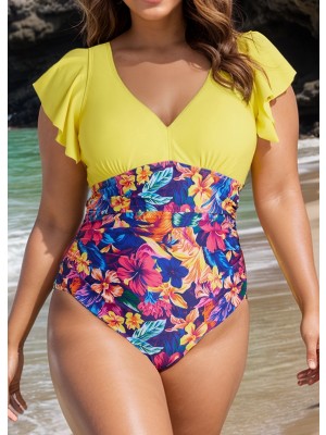 Yellow with Tropical Floral Print Ruffle Sleeved One Piece Swimsuit